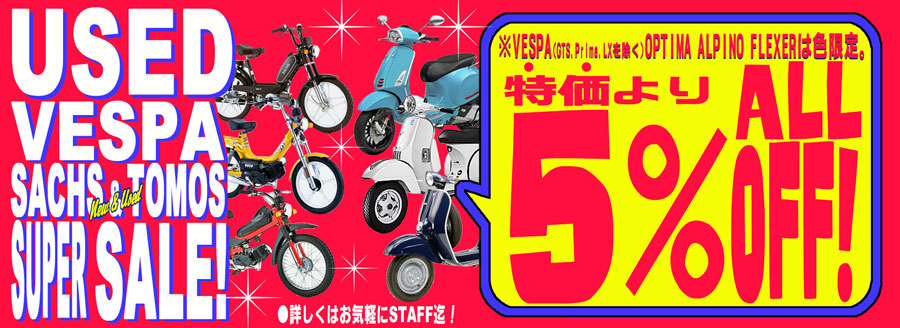 ●HONORARY'S USED VESPA SUPER SALE(GTS・Primavera・LX)・TOMOS・SACHS(新車) SUPER SALEで特価からALL10%OFF!! SALE開催中です!!